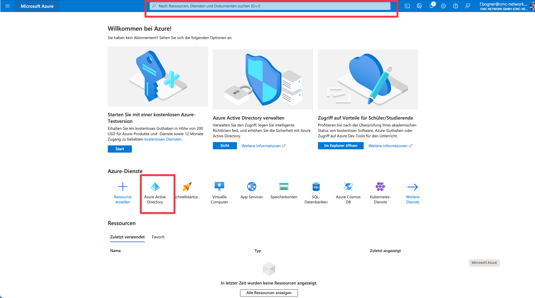 Nun öffnen wir Azure Active Directory entweder über die Azure Dienste oder über die Suche