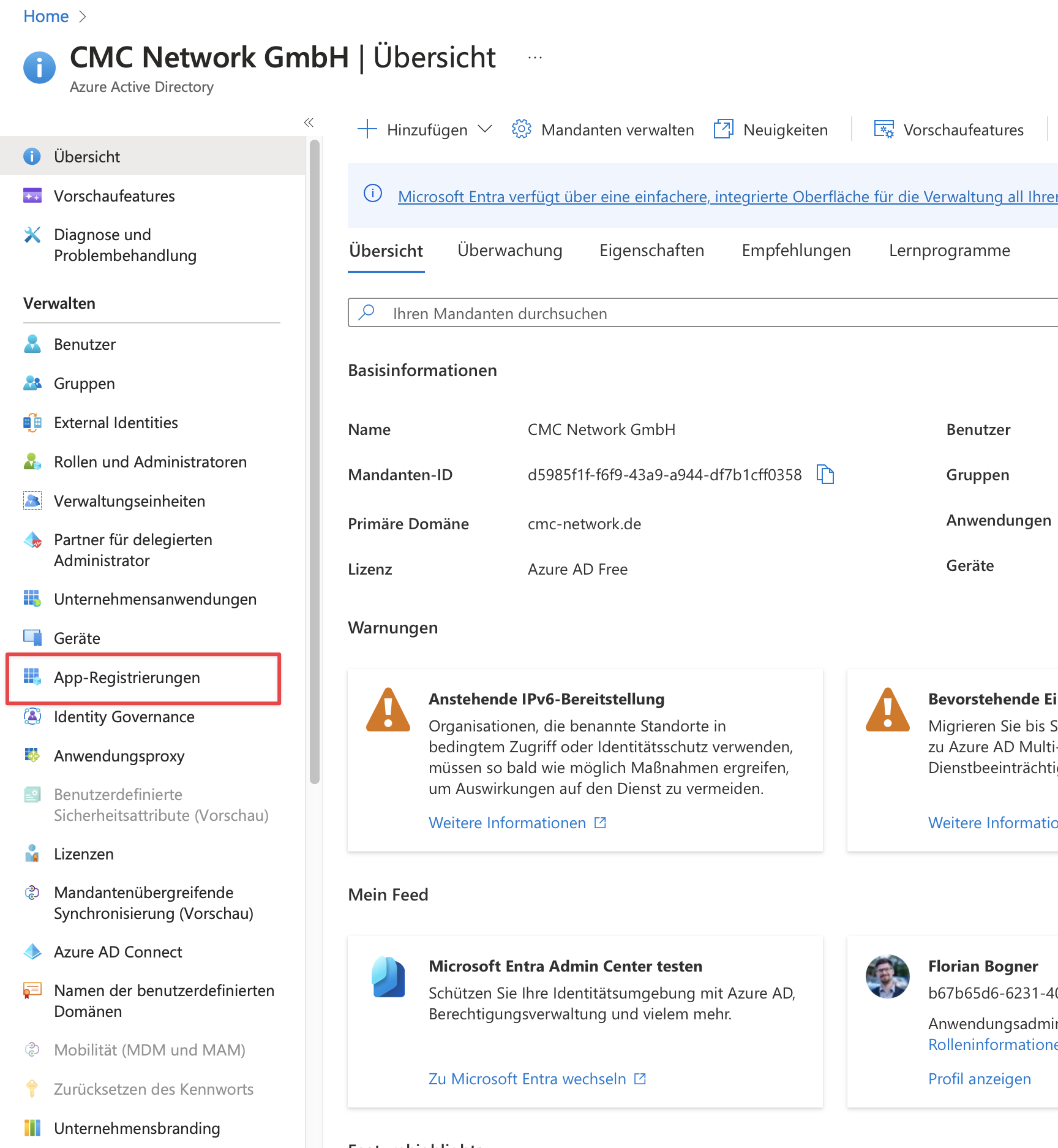 Jetzt klicken wir im Menü links unter Verwalten auf App-Registrierungen