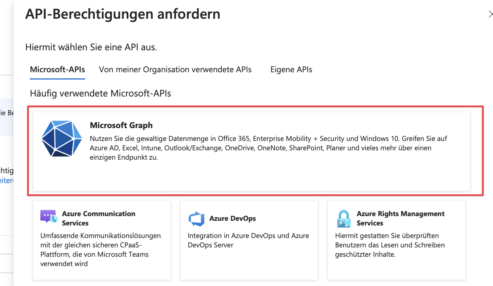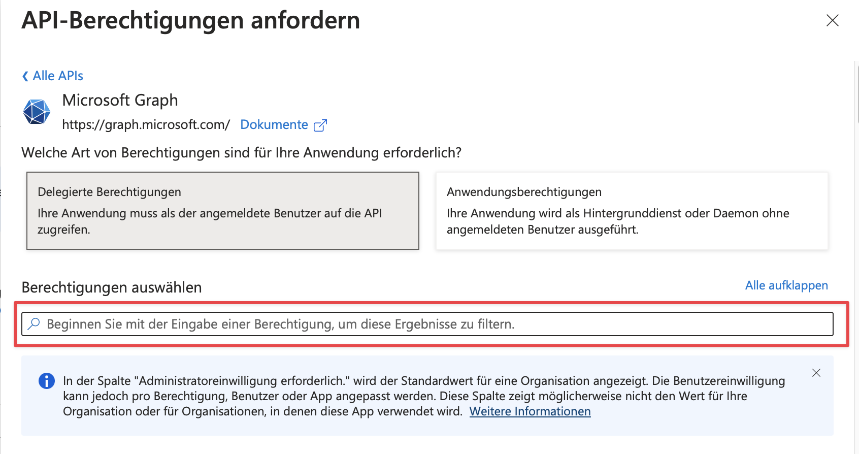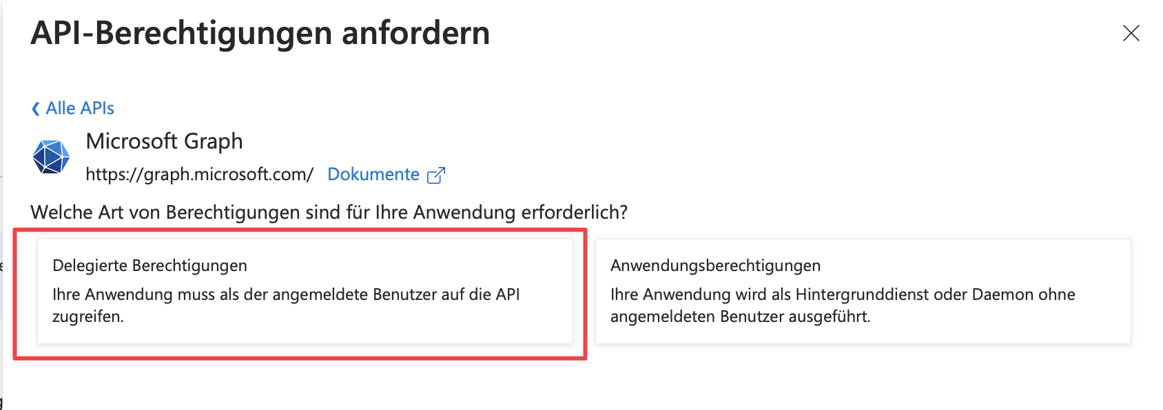 Dafür klicken wir im Menü links auf API-Berechtigungen, dann auf Berechtigung hinzufügen, dann auf Microsoft Graph und dann auf delegierte Berechtigungen.