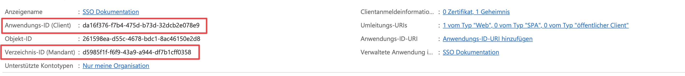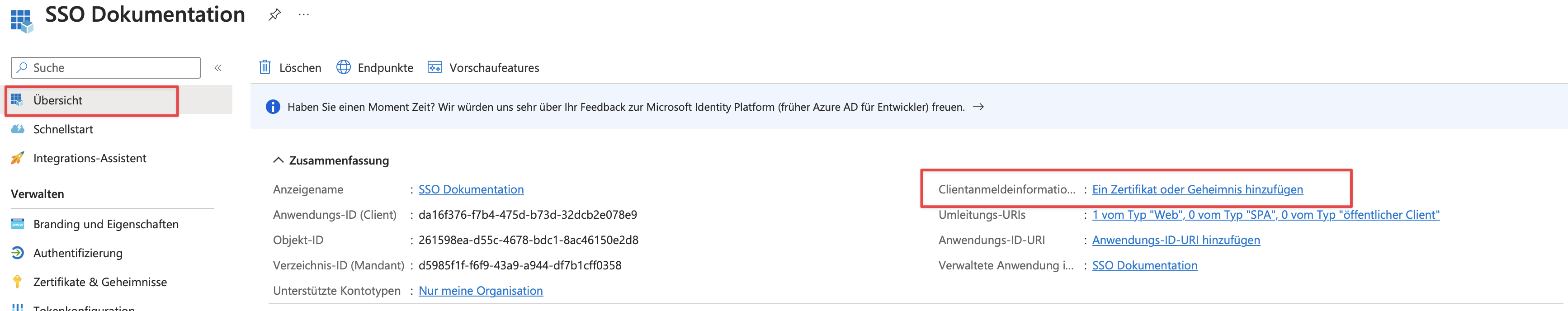 Wir gehen wieder auf die Übersicht der Anwendungsregistrierung und suchen hier die folgenden Werte: