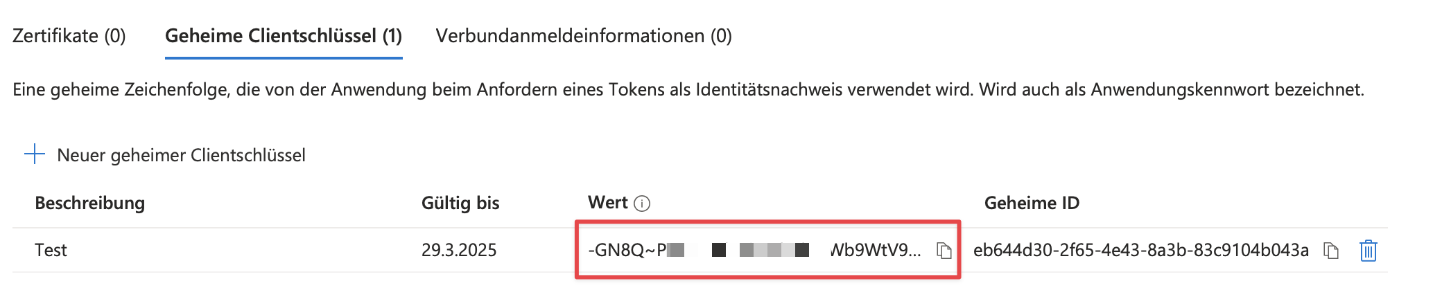 Anschließend steht das Secret nun in der Liste der Secrets